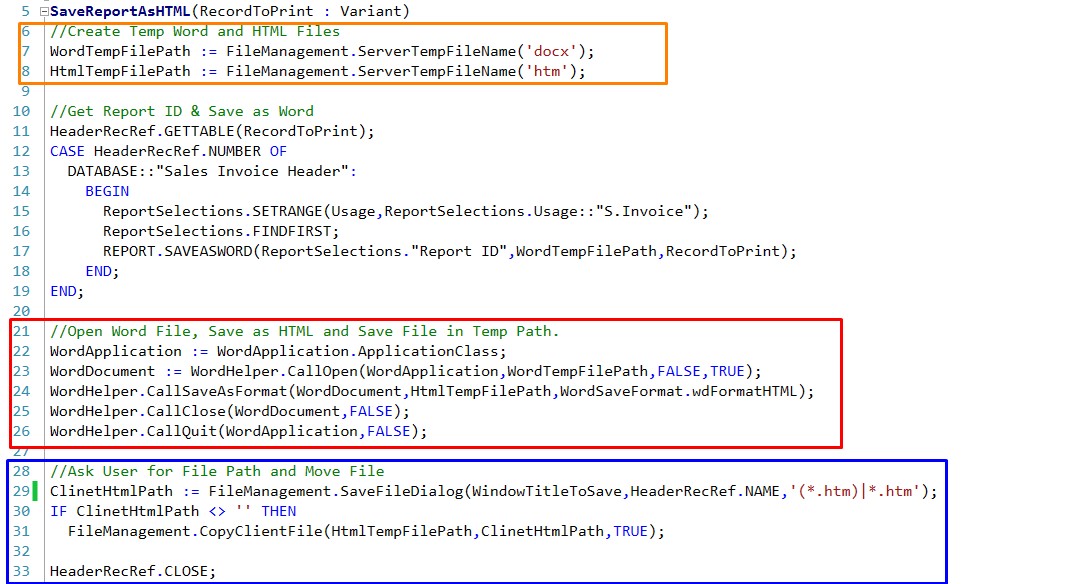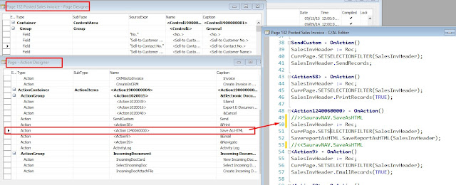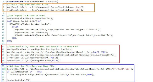 ============== Hi Readers, Origin of the today's post is a requirement to Save as Report as HTML in NAV 2016. This also brings some learnings for me so thought to share with you all. Till NAV 2009 (if I remember it correctly) Report.SaveAsHTML was supported but due to design changes in NAV Microsoft decided to obsolete this feature after NAV 2009. But later in NAV 2017, microsoft felt a need to the function and it came back in existence. But due to this confusion, I have provided a bad estimate and end-up spending good amount of time to translate a report (in my case word layout) to an HTML file. In this article, we will see how we can transform a word file to an HTML File using DOTNET Components. ** This article applies to NAV 2013, NAV 2013 R2, NAV 2015 and NAV 2016 as SaveasHTML exist in NAV 2017. ** Code in the article is to save HTML file as user defined location in the client. If you need to save in server, change DOTNET variable of RunOnClient = NO and set file path and Name instead of a popup. For the demo, i will be using a SaveasWord Feature to make it simple but you can also use word layout with same code base in your need. I am planning to keep all DOTNET re-writes in the same Codeunit that it can be used whenever required. Create a New Function - SaveReportAsHTML which input a Variant Record that needs to be printed. The Function Creates - 1. Two Temp files of Word and HTML extensions to be used in the process later. 2. Get Report ID using Report selection & Save Report as Word. 3. Open Word File using DOTNET, Save as HTML and Save File in Temp Path. 4. Ask User for File Path and Move File from Temp to the User Defined Path. Dotnet Variables used in function - WordApplication - Microsoft.Office.Interop.Word.ApplicationClass.'Microsoft.Office.Interop.Word, Version=15.0.0.0, Culture=neutral, PublicKeyToken=71e9bce111e9429c' WordDocument - Microsoft.Office.Interop.Word.Document.'Microsoft.Office.Interop.Word, Version=15.0.0.0, Culture=neutral, PublicKeyToken=71e9bce111e9429c' WordHelper - Microsoft.Dynamics.Nav.Integration.Office.Word.WordHelper.'Microsoft.Dynamics.Nav.Integration.Office, Version=9.0.0.0, Culture=neutral, PublicKeyToken=31bf3856ad364e35' WordSaveFormat - Microsoft.Office.Interop.Word.WdSaveFormat.'Microsoft.Office.Interop.Word, Version=15.0.0.0, Culture=neutral, PublicKeyToken=71e9bce111e9429c' All Code used for these four tasks is below. * You can extend Part two (Case Statement) as per your requirement. Report Code will remain same. Almost Done. Let's do calling from Sales Invoice Page. Add an action in Page and Call the function that we wrote above, as shown below. Let's Run. Share your thoughts about it. I have so many rewrites where I use Dotnet to get performance or only option to rewrite in new versions. If you have a scenario that we can discuss in future articles please put also that as the comment. If you want to use the code, please download an object from the on-drive. File Name - Microsoft Dynamics NAV -#SauravNav_Dotnet_Functions_Codeunit_50000 Please share your views. Happy to hear all of them !! Stay connected will be back soon. Regards, Saurav Dhyani saurav-nav.blogspot.in Источник: http://saurav-nav.blogspot.com/2017/...-nav-2017.html